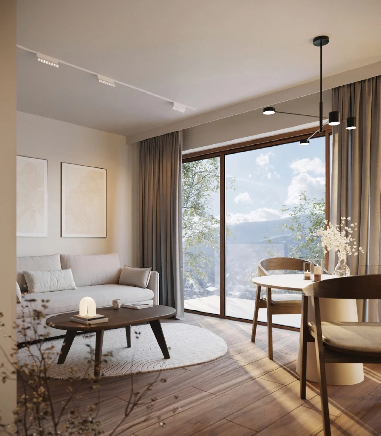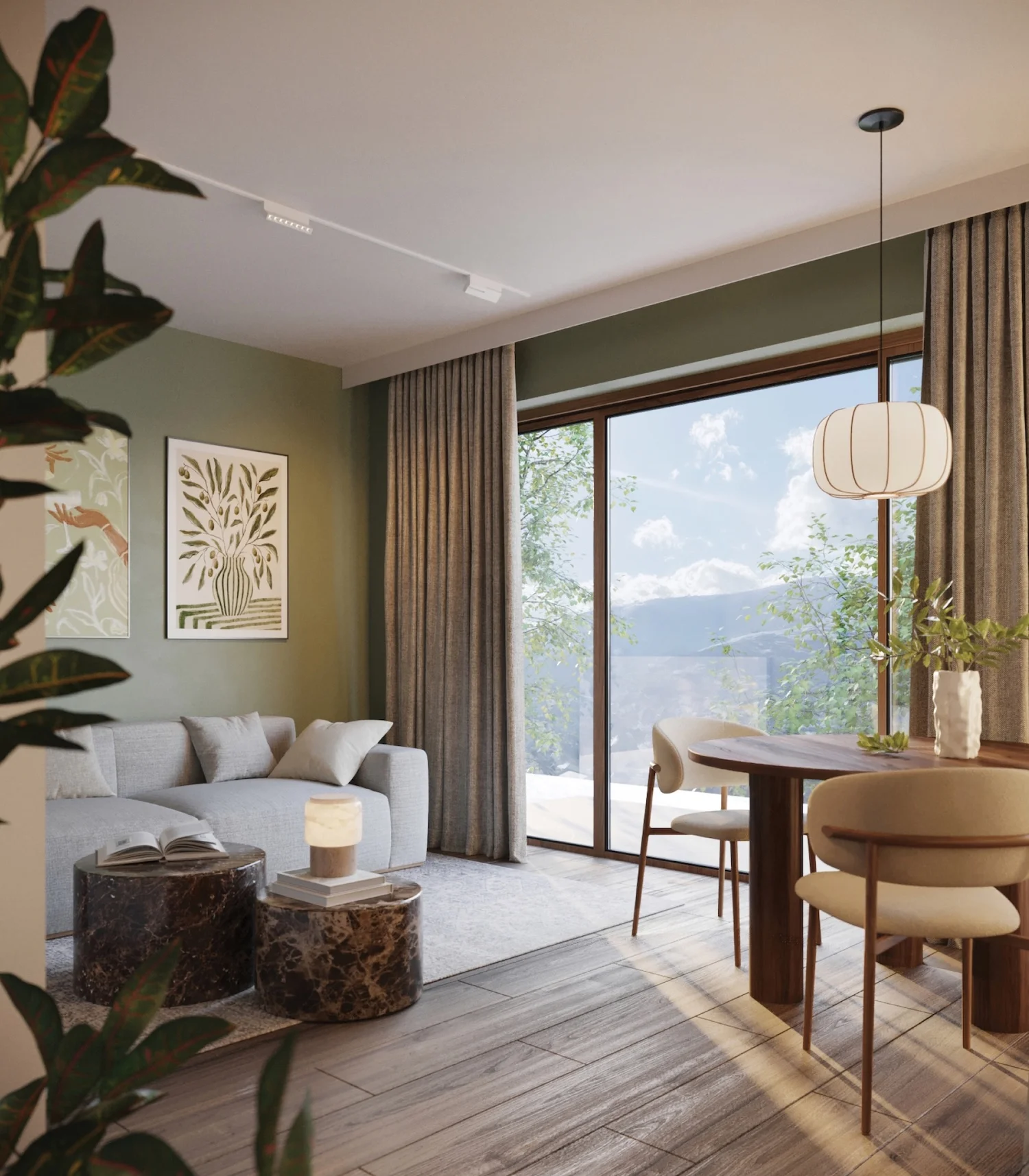 Wewnętrzny zielony dziedziniec oraz tarasy na dachu dostępne dla mieszkańców stworzą sympatyczną enklawę do relaksu wśród zieleni z widokiem na pobliskie pasma górskie Równicy i Czantorii.